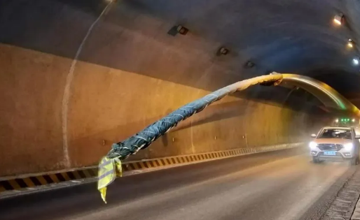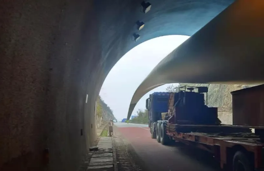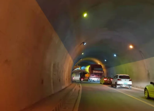 雷雨埡隧道內(nèi)大件運(yùn)輸車輛,目測距離隧道頂約1米。