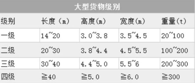 事實(shí)上,也不是隨便一個(gè)東西都能被稱為大件貨的,根據(jù)國家規(guī)定,長度在14米以上、寬度在3.5米以上、高度在3米以上的貨物,或是重量在20噸以上的單件及不可解體的成組(捆)貨物才能叫大件貨物。大件貨物又根據(jù)外形和尺寸重量分為四級(jí),詳情如下圖所示: